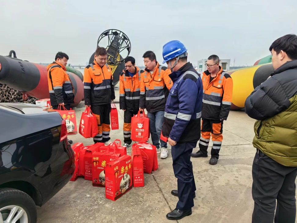 2024年2月2日下午,工会主席刘继忠与公司工会干部一同前往一线工作现场对奋战在一线的船员进行春节慰问并进行了亲切交流。刘主席首先对船员们在过去一年中的辛勤工作和无私奉献表示由衷的敬意和感谢,在与一线船员深入交流中,询问了他们的工作情况、生活状况以及对工会的期望和建议,随后,代表公司工会送上了慰问品和节日祝福。
